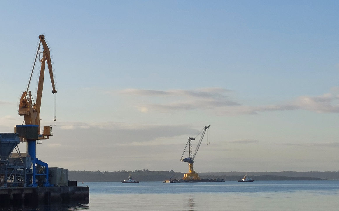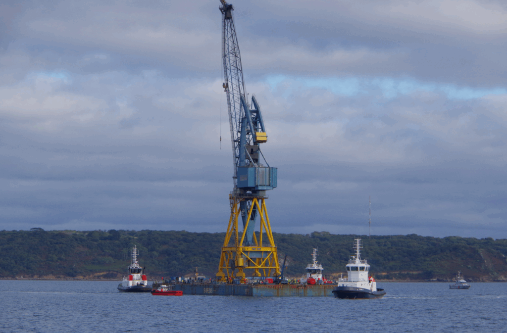 - Mardi 23 septembre : la nouvelle grue de 1 300 tonnes et 99 mètres de hauteur, flèche levée, assemblée sur le terminal EMR, a été chargée sur rail à bord de la barge Louis (une plateforme semi-submersible de 100 mètres sur 33) avant de quitter le port de commerce le 23 septembre en direction de la base navale. Convoi exceptionnel oblige, une zone de sécurité temporaire de 300 mètres autour de la barge a été créée par arrêté préfectoral. L’équipement a ensuite rejoint le bassin 8 et a positionné grâce à un système modulaire mille-pattes. Cette nouvelle grue a été conçue par Comete-J-Paris.