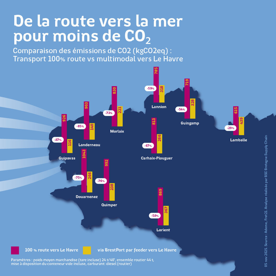 Depuis 2007, la compagnie CMA-CGM fait escale à Brest dans le cadre de son service Atlantic Feeder pour faire escale au Havre pour transbordement à destination / en provenance du monde entier.